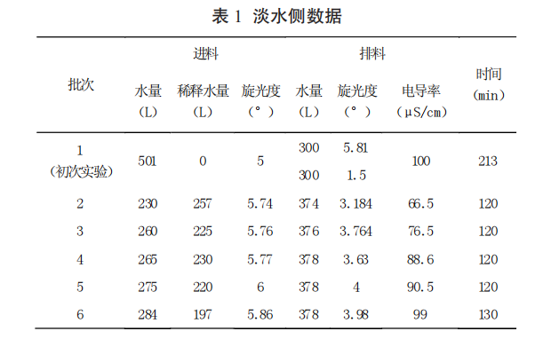 因?yàn)樵牧现腥鈮A的成分(旋光度)高,與濃水的濃度差大,必 然會出現(xiàn)肉堿竄進(jìn)到濃水里,原材料產(chǎn)生損害。為了更好地防止此狀況的產(chǎn)生,必須減少材料的濃度值,添加一定百分比的純凈水,進(jìn)而確保物 料的享有率,減少材料的損害。歷經(jīng)數(shù)批號的差異比例的試驗(yàn), 最后尋找到最好的純凈水配制量,巨大的下降了原材料損率,每批號的除鹽時(shí)間比較平穩(wěn),再現(xiàn)性較高。從 表 1 中 可 以 看 出 ,6 批 次 的 脫 鹽 終 點(diǎn) 均 能 夠 達(dá) 到