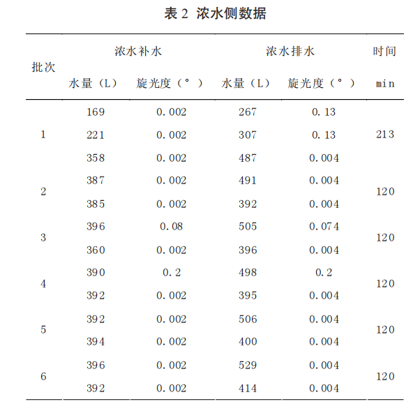 100μS/cm 下列,伴隨著純凈水的配制降低,談水的旋光度慢慢增 高,從表 2 中還可以看得出,除第一次試驗(yàn)外,后 5 批號中濃水排水管道的 旋光度很小,側(cè)邊體現(xiàn)肉堿的占比極低。根據(jù)估算剖析肉堿的損失率很小。融合表 1 和表 2 最后確認(rèn)了純凈水與原材料的較佳比例為 1:0.814,生產(chǎn)制造原材料液與濃水排出比為 1:2.85。
