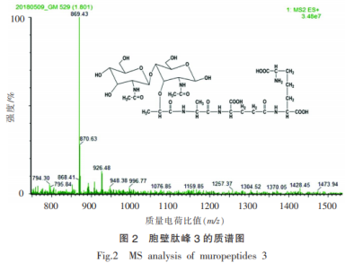 對(duì)每一個(gè)成分單峰搜集,除鹽后開展ESI-MS剖析,根據(jù)對(duì)3號(hào)峰的MS剖析(圖2),其分子離子[M] 為m/z869,伴峰:[M H] 為m/z870,該分子質(zhì)量構(gòu)成與GlcNAc-MurNAc-L-Ala-D-Glu-mesoDAP(標(biāo)準(zhǔn)偏差:869.9)一致,伴峰的產(chǎn)生是由于在共價(jià)鍵方式下,目地精彩片段會(huì)在水解全過程里加一個(gè)氫,分子質(zhì)量提升。因而,峰3即是總體目標(biāo)物二糖三肽(GM-TriDAP),其結(jié)構(gòu)示意圖如圖2所顯示。