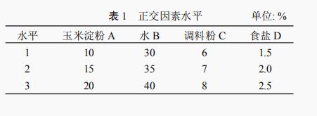 生豬肉(豬瘦肉和贅肉占比為7︰3)100 g,以生豬肉總品質(zhì)為標(biāo)準(zhǔn),加上不占比的玉米粉、水、調(diào)味品粉、食用鹽,選用四要素三水準(zhǔn)正交實(shí)驗(yàn),設(shè)計(jì)方案見表1,以感觀得分和榮譽(yù)出品率是調(diào)查指標(biāo)值,明確基本資料的較佳加上占比。隨后以復(fù)合磷酸鹽、谷氨酰胺谷丙轉(zhuǎn)氨酶、魔芋膠、海藻酸鈉—鈣化學(xué)交聯(lián)體加上量為4個(gè)要素,以肉丸子強(qiáng)度、延展性、回彈力、保水溶性和膠粘性為調(diào)查指標(biāo)值,開展單要素實(shí)驗(yàn)。