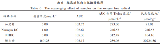 科學研究了柚皮苷、NariNgiNDC、NHDC及原兒茶醛4種試品對鐵離子的氧化作用,以VC為對比,以其濃度值-吸光度值制作標曲y=0.0006x 0.0943(R2=0.9998),4種試品對鐵離子的氧化作用以VC的相同復原工作能力時的使用量表明,結果如表5所顯示。