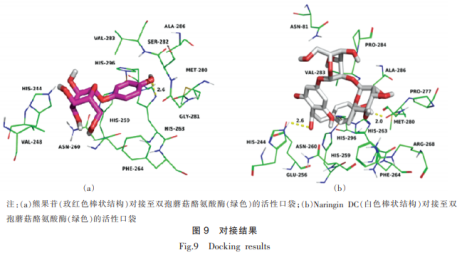 除此之外,熊果素和NariNgiNDC與雙孢蘑菇酪氨酸酶的結合能各自為-25.104kJ/MoL和-27.6144kJ/MoL,推斷熊果素和NariNgiNDC均很有可能為酪氨酸酶的緩聚劑,且NariNgiNDC的活力好于熊果素。