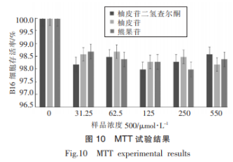 由圖10可看得出,NariNgiNDC、柚皮苷和熊果素在500μMoL/L及下列濃度值,由B16體細胞MTT實驗測出的體細胞成活率均超過90%,表明NariNgiNDC、柚皮苷和熊果素在500μMoL/L及下列濃度值是B16體細胞的安全性濃度值。