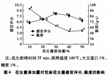 由圖4能夠看得出,伴隨著番茄醬加上量的擴大,試品的粘度先顯著降低,后保持穩(wěn)定。番茄醬粘度較麻醬粘度小,故番茄醬加上量越大,試品的粘度越??;感觀點評層面,番茄醬加上量較較少時,反映出不來花生仁的香氣和口味,加上量太多時,則遮蓋了麻醬自身的芳香和味兒。因而,番茄醬加上量以30%為 最好。