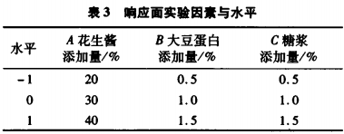 依據(jù)單要素試驗結果,明確花生仁烤制溫度 140℃、花生仁烤制時間30min,挑選番茄醬加上量 (A)、大豆蛋白粉加上量(曰)和糖槳加上量(C)為調查 要素,以白芝麻番茄醬感觀得分為關鍵響應值,開展響應面試驗。響應面試驗要素與水準見表3,響應面 實驗方案設計及結果見表4,響應面回歸分析方差分析見表5。