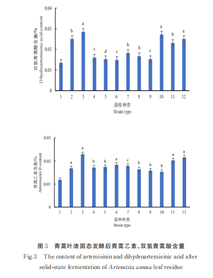 由圖 3 由此可見,青篙葉渣歷經(jīng)固態(tài)發(fā)酵,雙氫青篙酸和青篙乙素成分明顯提升,總體呈上漲發(fā)展趨勢。數(shù)據(jù)信息表明,青篙葉渣經(jīng)蕨類枯草芽孢菌發(fā)醇后與實驗組較為,雙氫青篙酸和青篙乙素成分各自提升了 111. 74%(P<0. 05)和 71. 15%(P<0. 05);次之是瑞士乳桿菌,發(fā)醇后其雙氫青篙酸成分提升了 101. 93%(P<0. 05);青篙葉渣經(jīng)丁酸梭 菌 發(fā)醇后,其青篙乙素成分提升了82. 67%(P<0. 05)。