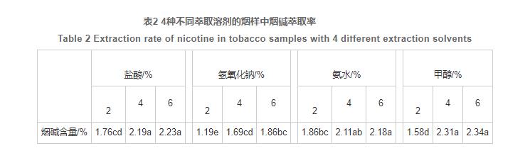 尼古丁是強(qiáng)正負(fù)極的有機(jī)化合物,可溶強(qiáng)電解質(zhì)和工業(yè)甲醇,該實(shí)驗(yàn)選擇不一樣含量的硫酸、氫氧化鈉溶液、氫氧化鈉和工業(yè)甲醇調(diào)查不一樣有機(jī)溶劑的提取實(shí)際效果(表2)。