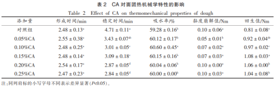 Mixolab混和實驗儀能夠與此同時測量面糊的質(zhì)地特點及木薯淀粉的糊化特點。由表1得知,與實驗組對比,加上FA后對面糊的吸水性、產(chǎn)生時間及粘度溶散值無明顯危害。殊不知FA的加上明顯減少了面糊的平穩(wěn)時間,這可能是因為FA的加上針對面糊中二硫鍵有氧化作用,能夠促使面糊在達(dá)到最佳的拌和時間后奔潰,減少其可靠性。伴隨著FA加上量的提升,面糊的平穩(wěn)時間慢慢減少。FA的加入還明顯上升了面糊的回生值。回生值表明木薯淀粉糊化后受冷發(fā)生木薯淀粉分子結(jié)構(gòu)重新排序并重結(jié)晶的狀況,在宏觀經(jīng)濟(jì)上主要表現(xiàn)為木薯淀粉糊疑膠化。當(dāng)加上不一樣加上量的FA后,面糊回生值明顯上升,說明加上FA后,面糊的木薯淀粉糊疑膠化水平上升,分子結(jié)構(gòu)排序較井然有序。從表2能夠看得出,與實驗組對比,加上不一樣含量的CA對面糊的吸水性、產(chǎn)生時間及粘度溶散值無顯著危害,而CA的加上明顯減少了面糊的平穩(wěn)時間,隨加上量的上升,面糊的可靠性越差。CA的增加也明顯上升了面糊的回生值,木薯淀粉糊疑膠化水平上升,分子結(jié)構(gòu)排序井然有序。