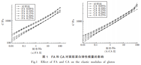 耗損角正切值tanδ為G''與的G'比率。tanδ能夠體現(xiàn)原材料的黏延展性特點,反映試品的理化性質(zhì)貼近于固態(tài)或是液態(tài),當(dāng)tanδ<1時表明試品的質(zhì)量貼近于固態(tài),而當(dāng)tanδ>1則表明試品的特性類似液體。tanδ的改變能夠呈現(xiàn)出試品玻璃化溫度的轉(zhuǎn)變,當(dāng)tanδ減少時,表明試品玻璃化溫度擴(kuò)大,相反試品的玻璃化溫度減少。如圖所示3所顯示,本實驗全部實驗組的彈性模具(G')均超過粘性應(yīng)變速率(G''),即面條蛋白質(zhì)的tanδ均低于1,表明面條蛋白質(zhì)具備相近固態(tài)的特性,與Khatkar等的檢驗結(jié)果同樣。而相較于對照實驗,F(xiàn)A和CA的加上針對面條蛋白質(zhì)的tanδ無顯著危害。