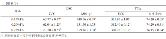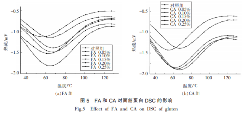 3和表4是加上FA和CA對面條蛋白質(zhì)熱學特性危害情形的結(jié)果。圖4為熱重分析的結(jié)果,在其中a和b各自意味著面條蛋白質(zhì)的TGA和DTG圖。由圖得知,與實驗組對比,加上FA和CA后,熱溶解溫度(Td)明顯降低,而600℃時的熱損率明顯提高,均在加上量為0.25%時到達了最高值(FA為74.15%±0.04%,CA為74.79%±0.48%),表明加上FA和CA會使面條蛋白質(zhì)原來的構(gòu)造發(fā)生改變,越來越更加疏松,緊度減少。從圖5能夠看得出,伴隨著FA與CA加上量的上升,面條蛋白質(zhì)的熱轉(zhuǎn)性露點溫度(ΔH)、熱轉(zhuǎn)性溫度(Tp)均減少,在FA與CA的增加量為25%時,面條蛋白質(zhì)的熱轉(zhuǎn)性露點溫度(ΔH)各自做到極小值,各自為(129.16±1.31)J/g和(148.60±0.69)J/g,Tp各自為(61.80±0.57),(55.38±0.95)℃。熱轉(zhuǎn)性溫度(Tp)是用以評價材料的分子結(jié)構(gòu)流通性和凝固水平的主要指標值,熱轉(zhuǎn)性溫度減少代表著原材料產(chǎn)生解聚。結(jié)果能夠證實,添加FA和CA促使面條蛋白質(zhì)的空間布局越來越疏松混亂。在DSC結(jié)果中,熱轉(zhuǎn)性露點溫度(ΔH)體現(xiàn)了原材料的吸水性與疏水性,從結(jié)論還可以看得出,伴隨著FA和CA加上量的提升,ΔH明顯減少,說明面條蛋白質(zhì)的疏水性慢慢降低,這可能是因為面條蛋白質(zhì)內(nèi)部的水份市場競爭造成其構(gòu)造進行,即FA和CA的增加量會明顯危害面條蛋白質(zhì)的構(gòu)造。