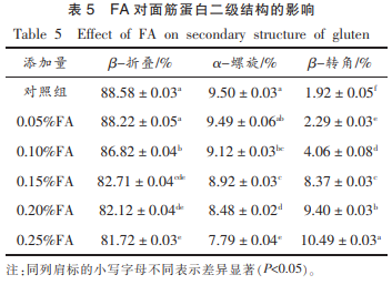 表5及表6各自為加上FA與CA對面條蛋白質(zhì)各二級結(jié)構(gòu)相匹配峰總面積占總峰總面積的百分數(shù)。從結(jié)論還可以看得出,β-伸縮是面條蛋白質(zhì)的關(guān)鍵二級結(jié)構(gòu),這與Bock等的分析結(jié)果同樣。加上了FA和CA顯著降低了面條蛋白質(zhì)的β-伸縮成分。據(jù)Ferrer等的研究表明,面條蛋白質(zhì)中β-伸縮越多,意味著面條蛋白質(zhì)構(gòu)造越平穩(wěn),且面條蛋白質(zhì)構(gòu)造的層次性和α-螺旋式的占比呈成正比,本實驗中對照實驗的β-伸縮成分最大,做到88.58%±0.03%,表明對照實驗的蛋白質(zhì)的功能更為平穩(wěn)。而加上FA和CA后,β-伸縮的成分隨加上量的增高慢慢減少,當FA與CA的增加量為0.25%時,β-伸縮的成分各自為81.72%±0.03%,83.23%±0.02%,表明加上FA和CA會使面條蛋白質(zhì)構(gòu)造的可靠性受到損壞,該實驗結(jié)果與面條蛋白質(zhì)熱學特性檢驗結(jié)果一致。伴隨著FA及CA加上量的提升,α-螺旋式的占比慢慢降低,在到達最大加上量時,加上FA與CA面條蛋白質(zhì)α-螺旋式構(gòu)造的成分各自為7.79%±0.04%,6.87%±0.04%,表明加上FA和CA減少了面條蛋白質(zhì)構(gòu)造的有序化,使面條蛋白質(zhì)的蛋白質(zhì)的功能隨加上量的提高而漸漸越來越錯亂混亂。