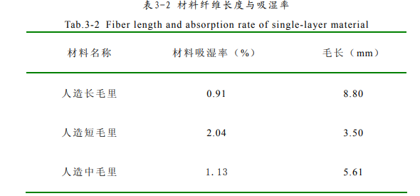 在對(duì)單面原材料與組成原材料的吸水性開展檢測后,大家發(fā)覺單面羊毛絨的吸水性好于單面人造毛,可是開展復(fù)合型以后,納帕革-人工合成短毛里的吸水性最好,因而充分考慮原材料的纖維長度是不是對(duì)資料的吸水性有關(guān)系,如表 3-2 所顯示為原材料的吸潮率與原材料纖維長度。