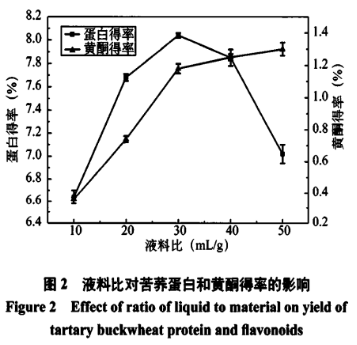 在偏堿情況下超聲波同歩獲取苦蕎麥蛋白質(zhì)和黃酮類化合物,伴隨著pH的擴(kuò)大二者的提取率也隨著擴(kuò)大,表明偏堿標(biāo)準(zhǔn)有益于苦養(yǎng)蛋白質(zhì)和黃酮類化合物的總混。當(dāng)pH為9時(shí),蛋白質(zhì)得率超過最高值7.89%,黃酮類得率最高值1.12%。但伴隨著pH的再次擴(kuò)大二者的提取率均呈下降趨勢。這是由于苦蕎麥蛋白質(zhì)在強(qiáng)酸自然環(huán)境下能造成水解反應(yīng)、脫氨及其脫羧反應(yīng)等反映,危害理化性質(zhì),毀壞蛋白質(zhì)的功能,造成蛋白明顯轉(zhuǎn)性。pH過高就會(huì)直接影響商品顏色及其發(fā)生其它不良反應(yīng),在酸沉全過程中也會(huì)使水溶液中鹽份提升,產(chǎn)生鹽溶狀況。充分考慮產(chǎn)品成本及其環(huán)境保護(hù)等要素,采用pH為9的水溶液開展苦蕎麥蛋白質(zhì)和黃酮類化合物的較佳獲取標(biāo)準(zhǔn)。