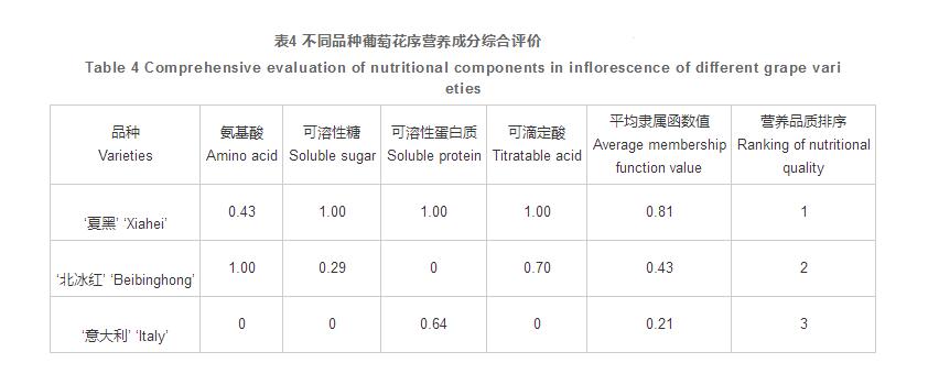 從表4能夠看得出,根據(jù)碳水化合物、可溶性糖、可溶蛋白和可滴定管酸等營養(yǎng)成分指標(biāo)值,對紅提花序的養(yǎng)分質(zhì)量開展點評,結(jié)果顯示,‘夏黑’花序的養(yǎng)分質(zhì)量最好是,‘北冰紅’其次,‘西班牙’較弱。根據(jù)該結(jié)果,‘夏黑’花序合適研發(fā)成生鮮的休閑零食,如既食涼菜等。