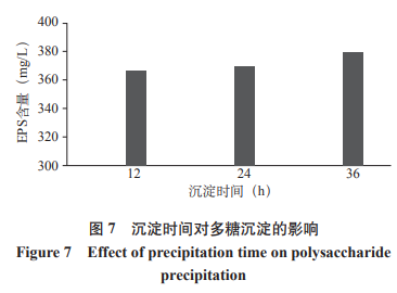 酒精沉積含糖量中在4℃標(biāo)準(zhǔn)下各自醇沉12h、24h、36h,測(cè)量胞外含糖量的生產(chǎn)量,如圖所示7所顯示。醇沉?xí)r間與胞外含糖量成分的相互關(guān)系不顯著。而試驗(yàn)操作過(guò)程中,添加酒精后直接造成沉積,而且伴隨著醇沉?xí)r間的提升,沉淀色調(diào)持續(xù)加重。為了更好地確保粗多糖的純凈度,醇沉?xí)r間選12h最合適。