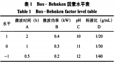 取粒度為120目地桃漿粉10g于量杯內(nèi),添加100mL雙蒸水泡浸24h,制取濃度值為0.1g/mL的原桃漿液,各自調(diào)至不一樣的pH(pH2、pH3、pH4、pH10、pH11、pH12)、設(shè)定不一樣的料液比(1/10、1/20、1/30、1/40和1/50),放置微波加熱管式反應(yīng)器中,設(shè)定微波加熱輸出功率為0W、100W、