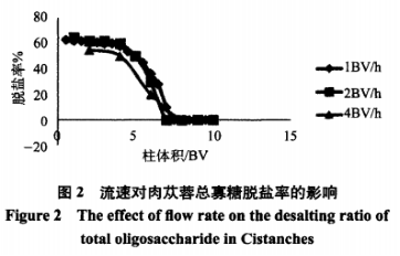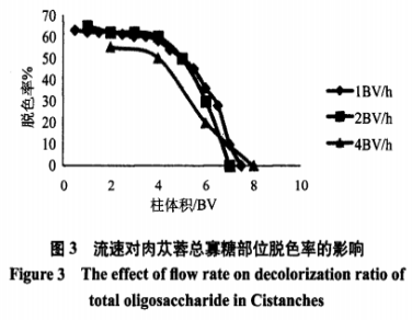 由圖2得知,伴隨著料液流動(dòng)速度的提升,蓯蓉低聚糖除鹽率展現(xiàn)下降趨勢(shì),在流動(dòng)速度做到4BV/h時(shí)除鹽實(shí)際效果顯著降低,融合時(shí)間成份,料液除鹽的最好流動(dòng)速度列入2BV/h。由圖3得知,流動(dòng)速度變慢,褪色比越高,在流動(dòng)速度做到4BV/h時(shí)褪色實(shí)際效果顯著降低,融合時(shí)間成份,料液褪色的最好流動(dòng)速度列入2BV/h,這說(shuō)明流動(dòng)速度慢有運(yùn)用蓯蓉低聚糖中的黑色素充足在環(huán)氧樹(shù)脂床中吸咐,該環(huán)氧樹(shù)脂能夠?qū)?BV的濃度值在10%的蓯蓉低聚糖位置開(kāi)展充足褪色。