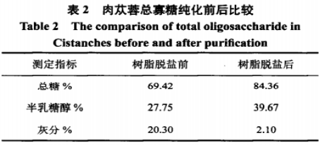 綜上所述,蓯蓉總低聚糖最好除鹽褪色標(biāo)準(zhǔn)為L(zhǎng)S-840酸堿性陰離子互換環(huán)氧樹(shù)脂與LS-850偏堿陽(yáng)離子互換環(huán)氧樹(shù)脂柱容積之比1.2∶1,流動(dòng)速度為2BV/h,蓯蓉總低聚糖位置的濃度值應(yīng)是10%上下。在這里前提下,解決4BV的蓯蓉總低聚糖,除鹽率是93.2%,褪色率是53.0%。蓯蓉總低聚糖位置在除鹽褪色后成分及灰份轉(zhuǎn)變?nèi)绫?所顯示。