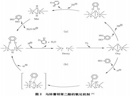 多酚氧化酶(Polyphenoloxidase,PPO)是綠色植物身體普遍現(xiàn)象可被分離出來純化得到的酚酶,其構(gòu)造為每一個亞基含有一個Cu2 做為輔基,以氧做為受氫體的一種尾端抗霉素。酶是蛋白組成的生化反應(yīng)金屬催化劑,PPO催化反應(yīng)的化學(xué)反應(yīng)分成兩大類:一類是甲基化功效,造成酚的鄰甲基化;二類是化學(xué)作用,使鄰苯二酚空氣氧化為鄰醌。植物細(xì)胞內(nèi)的酶當(dāng)做光合作用的傳送物質(zhì),維持著酚一醌的穩(wěn)定平衡,當(dāng)體細(xì)胞遭到機械設(shè)備傷害后,O2很多入侵造成醌類的持續(xù)轉(zhuǎn)化成,導(dǎo)致酚和醌中間的失調(diào),而醌的累積促使醌開展多聚化生成深褐色素,導(dǎo)致營養(yǎng)成分遺失。土豆鄰苯二酚的空氣氧化體制見圖2。