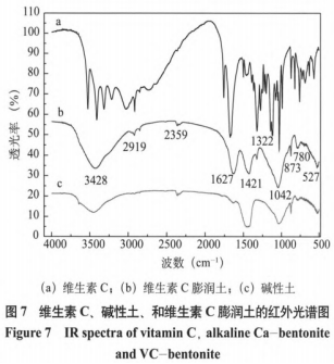圖7各自為維他命C、堿性土、維他命C鈉基膨潤(rùn)土三種原材料的紅外光譜圖。從圖上能夠看得出,堿性土經(jīng)改性材料后,物質(zhì)譜圖上的OH-特點(diǎn)峰(873cm-1處)抗壓強(qiáng)度變?nèi)?,而提升了光波長(zhǎng)約1627cm-1處的消化吸收峰(所屬C=O伸縮式震動(dòng))及其在1322cm-1處的消化吸收峰(所屬C—O縮震動(dòng)),這表明開展了酸堿中和反映,維他命C與鈉基膨潤(rùn)土是以離子鍵的方法相結(jié)合的。3525~3216cm-1為維他命C醇羥基R—OH的OH伸縮式震動(dòng)特點(diǎn)消化吸收峰,反映后這種官能團(tuán)被帶到鈉基膨潤(rùn)土的表層。除此之外,鈉基膨潤(rùn)土歷經(jīng)復(fù)合型改性材料后,其晶格常數(shù)中與Si一O一Si及Si一0A1有關(guān)的特點(diǎn)峰(527cm-1、780cm-1、1421cm-1、2359cm-1等處的震動(dòng)峰)沒(méi)有造成突出的轉(zhuǎn)變,因而維他命C對(duì)堿性土的改性材料并沒(méi)有對(duì)鈉基膨潤(rùn)土的構(gòu)造發(fā)生很大危害,這與透射電鏡結(jié)果一致。