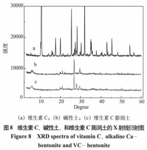圖8各自為維他命C、堿性土、維他命C鈉基膨潤(rùn)土三種原材料的X射線衍射圖。由圖能夠看得出,維他命C在10.55°時(shí)發(fā)生較大最高值,自此僅在19.96°、25.4°、26.5°、28.2°及31.9°周邊發(fā)生極強(qiáng)的透射峰。較為圖8的b、c兩曲線圖可發(fā)覺(jué),維他命C改性材料鈉基膨潤(rùn)土仍基本上保存堿性土的構(gòu)造,這與之前的紅外線定量分析結(jié)果一致。堿性土的001峰在2θ=5.969°處,依據(jù)Bragg方程計(jì)算蒙脫土的層間隔為1.478nm,而維他命C鈉基膨潤(rùn)土在2θ=5.854°處發(fā)生透射峰,測(cè)算其層間隔為1.508nm,這表明改性材料后層間隔增大,維他命C分子結(jié)構(gòu)進(jìn)入了偏堿土壤層間。
