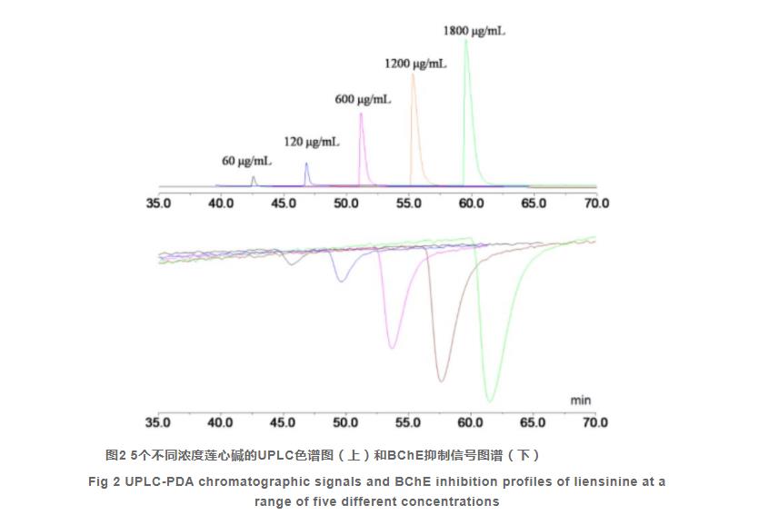 蓮子芯被報(bào)導(dǎo)具備BChE抑制效果,依照“2.3.2”項(xiàng)下的方式 ,應(yīng)用UPLC-DAD-BCD對(duì)蓮芯堿抑止活力開展剖析,見圖2。圖2為五個(gè)不一樣濃度值蓮芯堿的UPLC圖普和BChE抑止峰(60,120,600,1 200和 1800 μg·mL-1),以活力指紋圖譜的倒峰總面積為橫坐標(biāo)軸(X),蓮芯堿濃度值為縱軸(Y),獲得蓮芯堿的量效曲線方程Y= 351.56X3-1 098.8X2 1 473X-32.205 (R² = 0.999 7),說(shuō)明UPLC-DAD-BCD方式可以用以酶抑制劑的挑選和活力點(diǎn)評(píng)。由圖二上和下相匹配峰的保存期可獲得在線監(jiān)測(cè)的時(shí)間延遲為2 min上下。