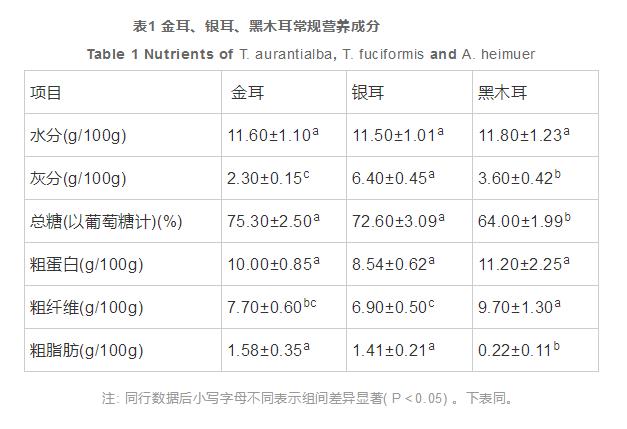 大家對(duì)金耳、白木耳、木耳的基本上營(yíng)養(yǎng)元素開(kāi)展了檢測(cè)分析,結(jié)果如表1。由表 1 知,3種膠原纖維食用菌菌種均帶有充足的總糖、蛋白、膳食纖維等營(yíng)養(yǎng)元素。3種膠原纖維食用菌菌種的總糖成分很高,在其中金耳總糖成分最大,做到了75.30%,金耳、白木耳的總糖成分差異不明顯。白木耳的灰份成分明顯高過(guò)金耳和木耳(P<0.05),做到6.40g/100g。粗蛋白和膳食纖維成分以木耳最大,各自為11.20 g/100g和9.70 g/100g,白木耳在3種膠原纖維菌中的粗蛋白成分最少,但三者差異不明顯(P>0.05)。金耳、白木耳的粗人體脂肪成分差別不明顯,木耳的粗蛋白質(zhì)成分極低,僅為0.22 g/100g。綜上所述,3種膠原纖維食用菌菌種全是帶有較高蛋白,低熱量、高纖維成分的食用菌,具備較高營(yíng)養(yǎng)成分和保健品開(kāi)發(fā)設(shè)計(jì)市場(chǎng)前景。