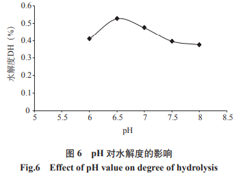 由圖6、圖7得知,伴隨著pH的上升,紅花籽粕的水解度和復(fù)原力發(fā)生先上升,后降低的發(fā)展趨勢,而且在pH為6.5時,其水解度和復(fù)原力較大。這很有可能與紅花籽粕中包含的蛋白質(zhì)的特性相關(guān)。因而,挑選6.5為適合pH。