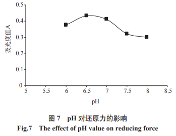 在酶使用量為2.9%、超聲波時間為10min、超聲波溫度為55℃的標(biāo)準(zhǔn)下,各自測pH為6、6.5、7、7.5、8的情形下水解反應(yīng)1h,其水解度和復(fù)原力結(jié)果如圖所示6、圖7所顯示。