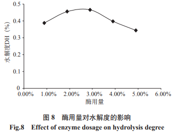 由圖8得知,伴隨著酶使用量的提升水解度擴(kuò)大,在其中在酶使用量為2.9%時水解度較大,圖9得知,伴隨著酶使用量的擴(kuò)大,復(fù)原力擴(kuò)大,在其中在酶使用量為1.9%,復(fù)原力較大,之后逐漸降低,在酶使用量2.9%時有下降趨勢,可是不顯著。綜合性考慮到水解度、復(fù)原力和節(jié)約成本要素,覺得1.9%為最好酶使用量。