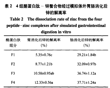 肽-鋅螯合物在腸胃環(huán)節(jié)的消化吸收可靠性對(duì)其消化吸收特別是在關(guān)鍵。在胃消化吸收環(huán)節(jié),螯合物的穩(wěn)定好,則鋅離子不容易被植酸融合;在腸環(huán)節(jié)鋅離子的離解則有利于其消化吸收。本分析中ζ電勢(shì)差較低的F1和F2成分在腸胃消化過(guò)程中鋅離子離解率比ζ電勢(shì)差較高的F3和F4成分低,表明肽的表層負(fù)電有益于肽-鋅螯合物在腸胃消化過(guò)程中的可靠性。