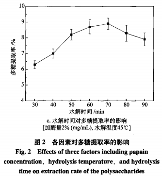 加酶量、水解反應(yīng)溫度、水解反應(yīng)時(shí)間三個(gè)要素對末水壇海菜含糖量獲取率的危害見圖2。