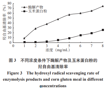 不一樣濃度值情況下酶解物質(zhì)及其玉米蛋白粉的羥氧自由基清除率結(jié)果見圖3。