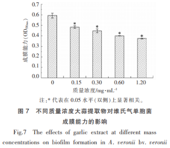 氣單胞菌屬的涂膜工作能力是受人群磁感應(yīng)管控的。根據(jù)結(jié)晶紫染色法和cLSm技術(shù)指標分析蒜頭提取液對維氏氣單胞菌生物膜系統(tǒng)產(chǎn)生工作能力的危害,結(jié)果見圖7、圖8。剖析得知,大蒜提取物對維氏氣單胞菌的生物膜系統(tǒng)產(chǎn)生有顯著性的抑制效果(P<0.05),且大蒜提取物的濃度值與其說抑止活力呈量效關(guān)聯(lián)。與實驗組對比,在1.20mg/mL大蒜提取物的效果下,尿培養(yǎng)24h后建立的生物膜系統(tǒng)量明顯減少36.7%(P<0.05)。根據(jù)剖析維氏氣單胞菌涂膜構(gòu)造的轉(zhuǎn)變,發(fā)覺經(jīng)1.20mg/mL大蒜提取物解決,該病菌產(chǎn)生的生物膜系統(tǒng)體細胞相對密度顯著減少,構(gòu)造比較松散。LI等發(fā)覺大蒜精油中的人群磁感應(yīng)活性物質(zhì)能高效抑止銅綠假單胞菌的生物膜系統(tǒng)造成及膜中的病菌總數(shù)。BjarnSholT等研究發(fā)現(xiàn),大蒜提取物解決后銅綠假單胞菌產(chǎn)生的細胞外基質(zhì)對抗菌素的耐受力大幅度降低。運用人群磁感應(yīng)緩聚劑影響食源性腐壞菌或病菌的生物膜系統(tǒng)產(chǎn)生,可減少微生物菌種環(huán)境污染,提升食品工業(yè)的安全系數(shù)。