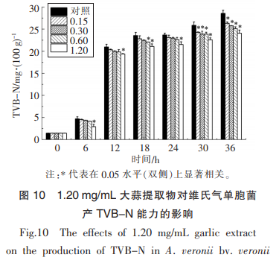 腐壞菌產(chǎn)TVB-n的工作能力與其說代謝的胞外胰蛋白酶魅力相關(guān)。病菌的胰蛋白酶魅力越高,產(chǎn)TVBn工作能力越強。大蒜提取物對注射維氏氣單胞菌的魚漿汁水TVB-n成分的危害見圖10。由此可見,大蒜提取物對維氏氣單胞菌造成TVB-n的功能有著一定抑制效果,且呈顯著的量效關(guān)聯(lián),在其中1.20mg/mL大蒜提取物對病菌產(chǎn)TVB-n的抑制效果更為明顯(P<0.05)。塑造36h后,含1.20mg/mL大蒜提取物的魚漿汁水的TVB-n成分為24.06mg/100mL,而對照實驗中TVB-n成分為28.56mg/100mL,即經(jīng)1.20mg/mL大蒜提取物解決,魚漿汁水中TVB-n的成分減少15.8%。這很有可能與維氏氣單胞菌的胞外胰蛋白酶基因的表達遭受抑止相關(guān)。