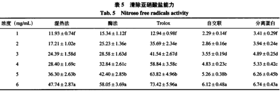 各自用PBs緩沖溶液配備濃度值為:lmg/mL、2mg/mL、3mg/mL、4mg/mL、5mg/mL、6mg/mL的大黑豆分離蛋白水溶液、自化學交聯(lián)大黑豆蛋白質(zhì)水溶液、寒濕法糖基化大黑豆蛋白質(zhì)水溶液、酶法糖基化大黑豆蛋水溶液及其對比物Trolox水溶液;以清除率為評價方法,對五種試品溶消除亞硝酸鈉工作能力開展較為,結(jié)果見表5。