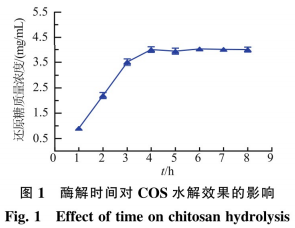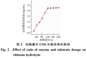 調(diào)查酶解時問、加酶量對殼聚糖酶酶解的危害。如圖所示1所顯示,還原性糖產(chǎn)生量隨酶解時問增加而升高。酶解4h內(nèi),還原性糖成分迅速提升,4h以后趨于平穩(wěn),最好酶解時問選中4h。南圖2得知,酶解全過程中,還原性糖產(chǎn)生量伴隨著加酶量的上升而逐步擴大。在加酶量為120U/g時,還原性糖產(chǎn)生量近最高值后平穩(wěn)。再次提升酶量無法使還原性糖濃度值明顯提升。最優(yōu)加酶量挑選為120U/g。