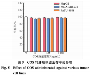 科學(xué)研究COS對人會晚期肝癌體細胞HepG2、人乳癌體細胞MDA-MB-231與人胰腺腫瘤體細胞PATU-899生長發(fā)育的危害(見圖5)。在給藥濃度值0~1000μg/mL狀況下,未留意到3株腫瘤干細胞有生長發(fā)育抑止?fàn)顩r,能夠覺得低濃度值的COS對腫瘤干細胞生長發(fā)育危害微乎其微。