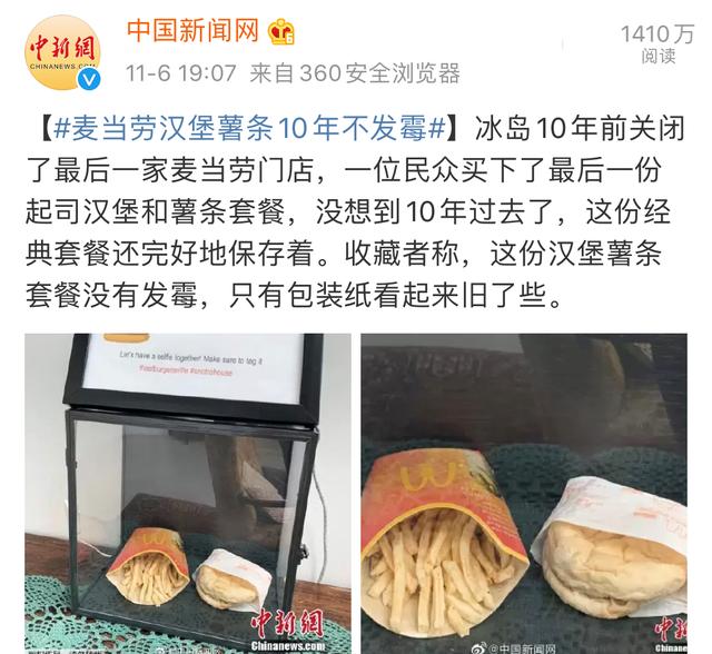 “冰島十年前關(guān)掉了最終一家肯德基店,一位住戶買下來了最終一份漢堡包和炸薯?xiàng)l,結(jié)果十年過去,這一份漢堡包和炸薯?xiàng)l還完好無損地保留著。根據(jù)外型,我們可以見到,這一份漢堡包和炸薯?xiàng)l并沒有長霉霉變,僅僅包裝舊了一些罷了?!?/p>