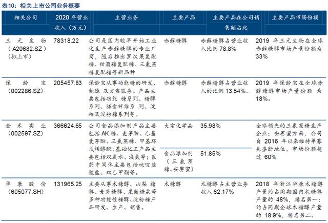 依據(jù)東興證券券商報告,A股代糖領頭企業(yè)為三元微生物(擬發(fā)售)、保齡寶(002286)、金禾實業(yè)?,F(xiàn)階段,三元微生物、保齡寶是世界首要的赤蘚糖醇制造商,市場占有率各自為33%、18%;金禾實業(yè)是安賽蜜的壟斷競爭市場制造商,且伴隨著三氯蔗糖新生產(chǎn)能力的推廣,也變成了世界技術領先的三氯蔗糖制造業(yè)企業(yè)。
