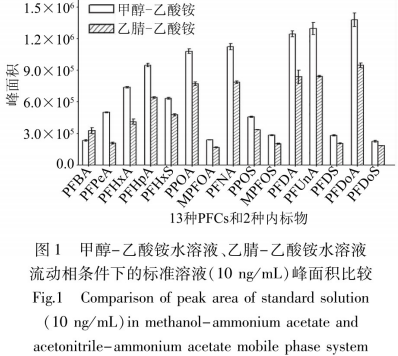 13種PFCs及2種放射性核素內(nèi)標(biāo)物為羧基或磺酸鹽,在流動性看中添加乙酸銨,能使水溶液維持一定的pH及電離度,能夠合理地提高電噴霧器離子化響應(yīng)值,并降低有機(jī)溶劑效用,改進(jìn)峰形。但也是有研究表明,較濃度較高的的乙酸銨對質(zhì)譜檢測有極強(qiáng)的抑制效果。規(guī)范及參考文獻(xiàn)中常用的乙酸銨濃度值為1~10mmol/L,本試驗(yàn)以工業(yè)甲醇和水為有機(jī)溶劑,各自配置同樣濃度值的乙酸銨甲醇溶液及乙酸銨溶液。根據(jù)較為1、2.5、5、10mmol/L四個不一樣濃度值情況下的檢測結(jié)果(見圖2)能夠 看得出,PFOS和PFDoA在1、2.5mmol/L濃度值的峰總面積較高且基本上相同,其他13種化學(xué)物質(zhì)均在乙酸銨濃度值為2.5mmol/L時(shí),色譜儀峰總面積做到最高值。