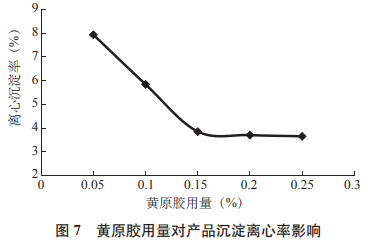 卡拉膠與羧甲基甲基纖維素鈉混配可做到協(xié)作提質(zhì)增效目地,有利于進(jìn)一步提高飲品的可靠性。圖7為卡拉膠使用量對水溶液離心式沉積率的危害,從圖7得知,伴隨著卡拉膠的使用量增加,離心式沉積率持續(xù)減少,至0.15%基本上不變。這來源于卡拉膠可吸咐水溶液含有正電的蛋白化學(xué)物質(zhì),進(jìn)而降低沉積產(chǎn)生,因而挑選卡拉膠使用量0.12%、0.15%、0.2%做為正交和要素調(diào)查水準(zhǔn)。