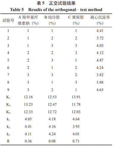 從表5得知,R3>R1>R2,即各要素對運(yùn)動型飲料的可靠性感觀危害次序?yàn)椋嚎ɡz>羧甲基甲基纖維素鈉>結(jié)冷膠,根據(jù)偏差剖析得知,該運(yùn)動型飲料的增稠劑使用量最好組成為A1B2C2,即羧甲基甲基纖維素鈉使用量0.4%,結(jié)冷膠使用量0.08%,卡拉膠使用量0.15%。在該復(fù)合型增稠劑使用量下,飲品的離心式沉積率是3.72%,久置無顯著沉積或分層次。