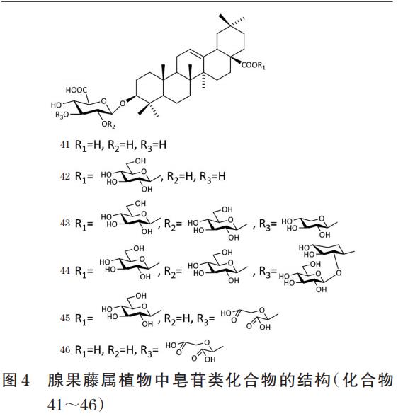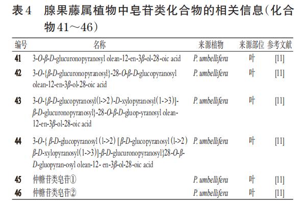 人參皂甙類物質(zhì)是由苷塊和糖原組成,一般是甾類或三萜類化學(xué)物質(zhì),已經(jīng)有科學(xué)研究表明,腺果藤屬綠色植物中富含人參皂甙類物質(zhì)。1996年Lavau等從膠果樹(shù)葉中分離出來(lái)評(píng)定出4個(gè)新齊墩果酸人參皂甙(化學(xué)物質(zhì)41~44)和兩個(gè)仲糖苷類人參皂甙(化學(xué)物質(zhì)45、46)。腺果藤屬綠色植物中人參皂甙類物質(zhì)的構(gòu)造見(jiàn)圖4,其有關(guān)信息見(jiàn)表4。