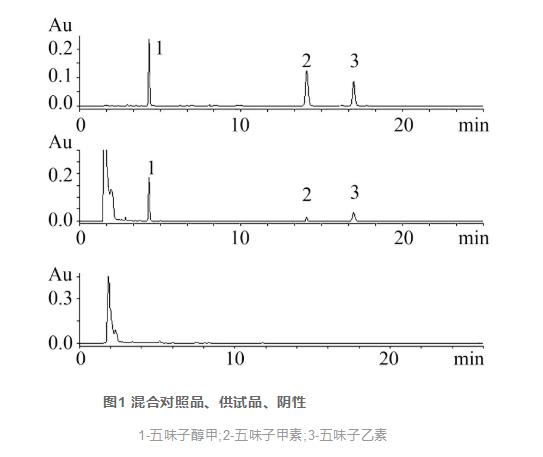 離子交換柱:AgilentExtendC18柱(250mm×4.6mm,5μm);流動性相:工業(yè)甲醇(A)-乙腈(B)-0.1%硫酸銨水溶液(C),梯度方向過柱:0~24min為35%~55%A,30%~30%B;24~27min為55%~35%A,30%~30%B;27~30min為35%~35%A,30%~30%B;檢驗(yàn)光波長:250nm;流動速度:1.1mL·min-1;進(jìn)樣量:10μL;柱溫:32℃。五味子醇甲、五味子乙素與鄰近色譜儀峰的分離度均超過1.5,基礎(chǔ)理論板數(shù)均不少于5000。