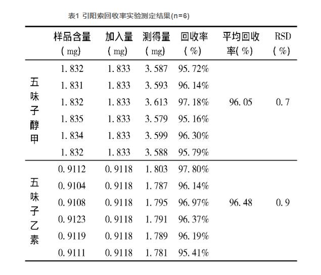 各自高精密稱量已經(jīng)知道成分的引陽索(生產(chǎn)批號20180604)約2.5g,6份,各自置100mL錐形瓶中,各自高精密添加對比水溶液:五味子醇甲對比水溶液(0.9165mg·mL-1)、五味子乙素(0.9118mg·mL-1)、各2.0、1.0mL,按“3.2.2”條方式制取供試水溶液,氣相10μL,結(jié)果測得五味子醇甲、五味子乙素均值利用率各自為96.05%(RSD=0.7%,n=6)、96.48%(RSD=0.9%,n=6),結(jié)果見表1。