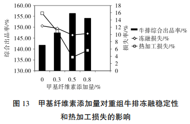 根據(jù)羧甲基纖維素在資產(chǎn)重組牛扒中的運用實驗,結(jié)果顯示:伴隨著羧甲基纖維素加上量的持續(xù)提升,資產(chǎn)重組牛扒凍融循環(huán)損害和熱處理損害均先后減少。當羧甲基纖維素加上量為0.5%時,資產(chǎn)重組牛扒凍融循環(huán)損害和熱處理損害最少,各自實現(xiàn)了9.86%和3.75%,比空缺組各自降低了2.52%和12.13%,牛扒榮譽出品率隨著提高了14.65%;牛扒強度和延展性也做到了最大值,各自為615.4g和13.1,各自比空缺組提高了13.42%和11.02%。