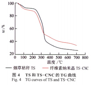 根據(jù)同歩熱分析儀對(duì)TS、TS-CNC開展熱重分析,獲得熱重曲線圖(圖4)和微商代理熱重曲線圖(圖5)及主熱裂解狀態(tài)參數(shù)(表2)。從圖4和表2能夠 看得出原材料TS的原始溶解溫度為204.94℃,歷經(jīng)亞硫酸銨空氣氧化解決及超音波粉碎后TS-CNC的原始溶解溫度為201.47℃,對(duì)比原材料,減少了1.7‰緣故可能是甲基纖維素非晶的粒度較小,比表面大,玻璃化溫度低,外露的活力官能團(tuán)較多,且沒有耐熱性高的木質(zhì)纖維素,使耐熱性降低。