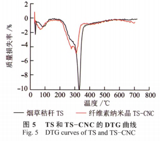 從圖5的DTG曲線圖中還可以看得出,相比于TS,TS-CNC的主熱裂解峰向超低溫區(qū)挪動(dòng),耐熱性能弱于TS,在主熱裂解溫度范圍內(nèi)(200~400℃),主要是甲基纖維素的β-1,4糖苷鍵和C=O、C-C的破裂,最后裂化為CO、C02、H2O等汽體。