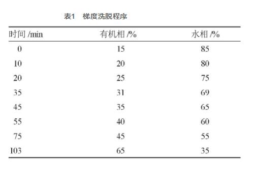 選用Shim-Pack XR-ODS Ⅲ (2.0 mmi.d×150 mm)離子交換柱,用工業(yè)甲醇-0.3%苯甲酸溶液為流動性相系統(tǒng)軟件梯度方向過柱,流動速度為0.2 mL·min-1,梯度方向過柱,檢驗光波長為297 nm,柱溫為25 ℃,氣相量為10 μL。梯度方向見表1。